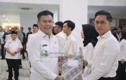 mediapatriot,-Bupati Pesisir Barat (Pesibar), Dedi Irawan, melantik secara langsung 409 Calon Pegawai Negeri Sipil (CPNS) yang berhasil lolos seleksi dan 4 CPNS lulusan Sekolah Tinggi Transportasi Darat (STTD), di Lobi Lantai 1 Gedung Marga Sai Batin, Komplek Perkantoran Pemkab Pesibar, Rabu (25/6/2025).