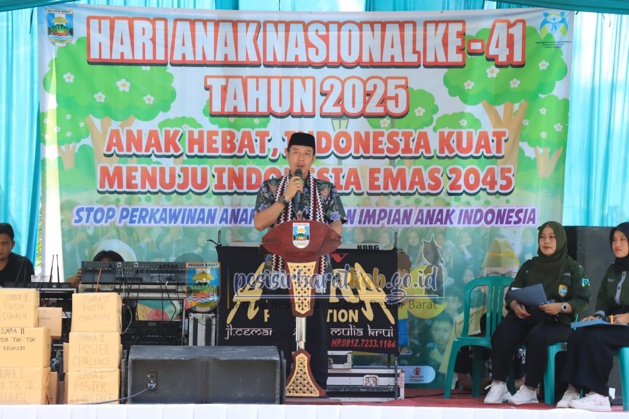 Mrcnett.com — Bupati Pesisir Barat (Pesibar), Dedi Irawan, bersama Wakil Bupati Irawan Topani, S.H., M.Kn., menghadiri peringatan Hari Anak Nasional (HAN) ke-41 Tahun 2025 yang digelar di Cottage Pariwisata Pantai Labuhan Jukung, Kamis (24/07/2025).