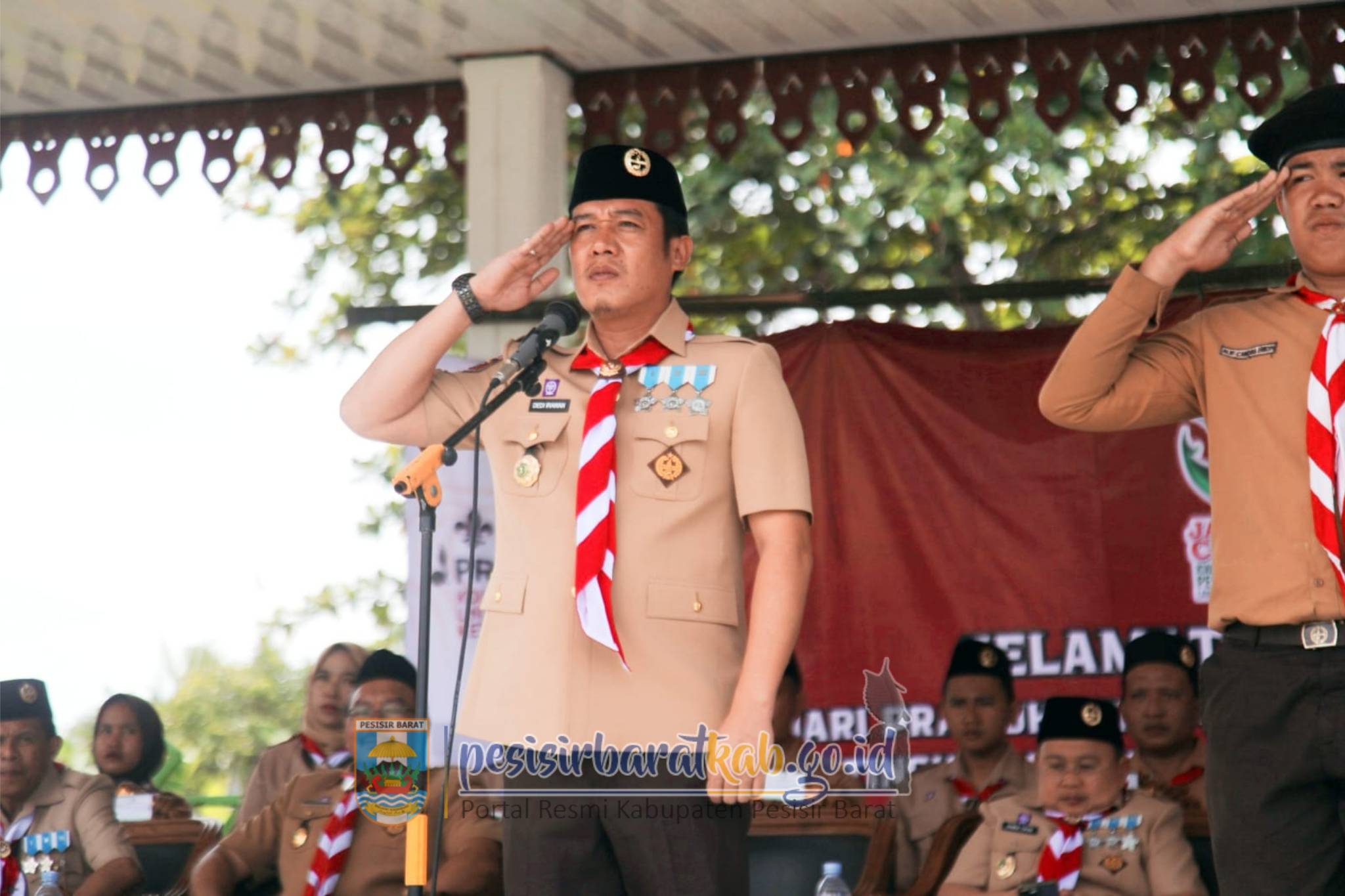 Mrcnett.com ~~ Bupati Pesisir Barat (Pesibar) sekaligus Ketua Majelis Pimpinan Cabang (Kamabicab) Gerakan Pramuka Pesibar, Dedi Irawan, menghadiri sekaligus menutup kegiatan Perkemahan Jambore Cabang Ke-1, di Lapangan Merdeka Labuhan Jukung Kecamatan Pesisir Tengah, Rabu (17/9/2025).