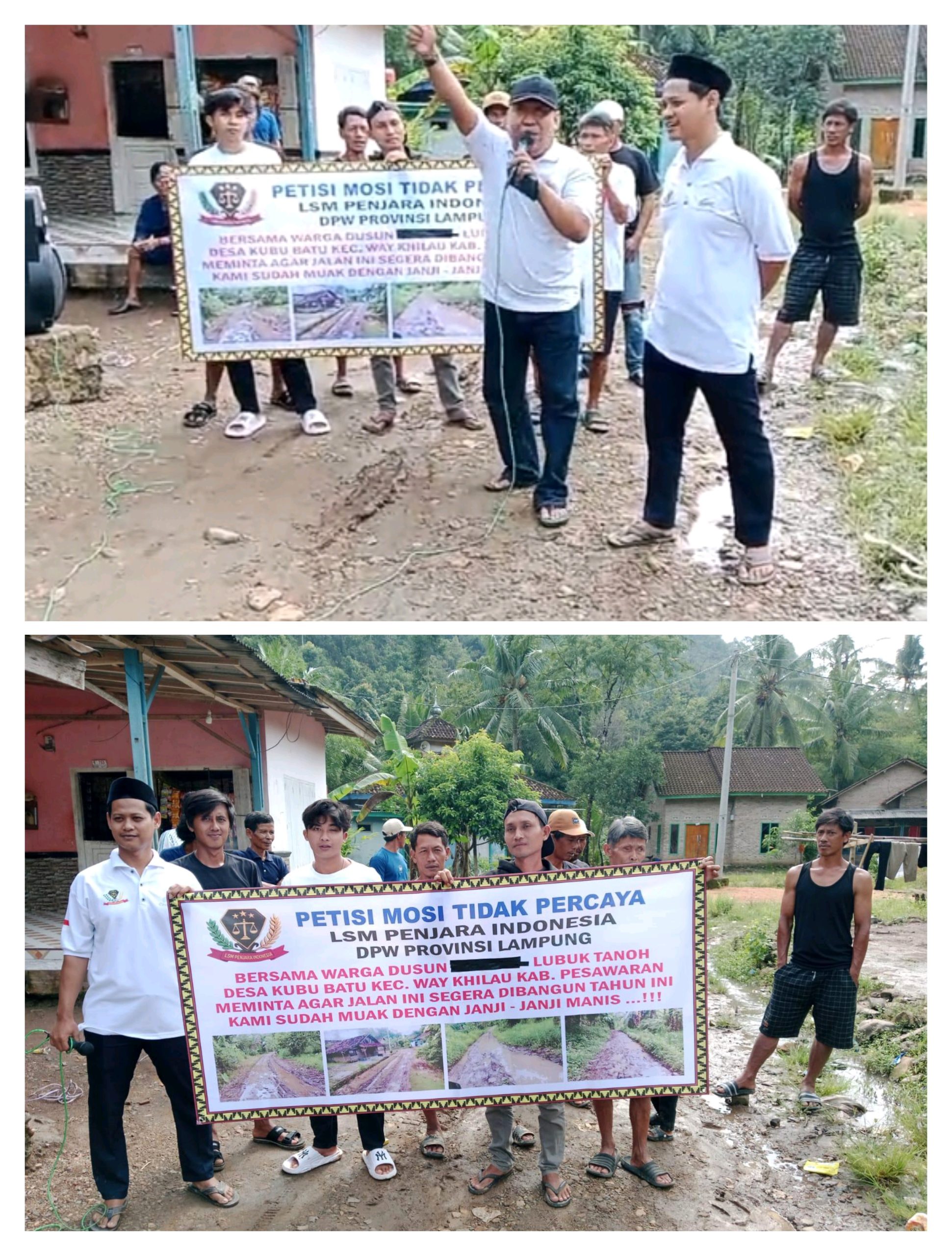 Pesawaran – Lembaga Swadaya Masyarakat (LSM) Penjara Indonesia Dewan Pengurus Wilayah (DPW) Provinsi Lampung bersama ratusan warga Dusun Lubuk Tanoh, Desa Kubu Batu, Kecamatan Way Khilau, Kabupaten Pesawaran, menggelar aksi demonstrasi turun jalan didusun lubuk tanoh dengan menyampaikan Petisi Mosi Tidak Percaya kepada Pemerintah Daerah (Pemda) Kabupaten Pesawaran. Aksi ini dilakukan sebagai bentuk kekecewaan mendalam atas kondisi infrastruktur jalan yang rusak parah dan belum mendapatkan penanganan yang nyata.