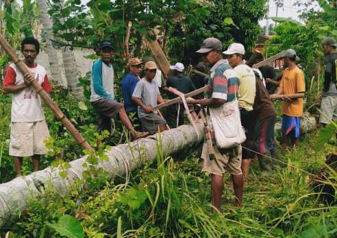 Ketika ditemui di lokasi, para warga tampak sibuk bekerja sama mengangkat dan mengangkut batang pohon kelapa menuju tepi sungai. Dengan alat seadanya, mereka bahu-membahu menyusun batang kelapa tersebut menjadi sebuah jembatan yang kokoh meski sederhana.